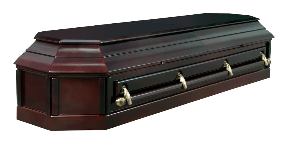 Элитный двухкрышечный гроб из массива дерева. Изделие представлено в двух цветах: классический орех и благородный венге. У данной модели верхняя крышка открывается для прощания, а нижняя остаётся закрытой. Свое название гроб приобрел благодаря уникальной форме восьмиугольника. Ручки двухкрышечного гроба крепятся по всей длине изделия, что облегчает процесс переноса гроба. Внутренняя драпировка гроба восьмигранника обита атласной стежкой.